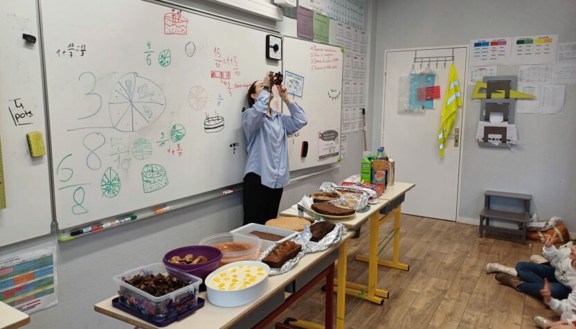 Les élèves de CP-CE1 ont été conviés par ceux de CE2-CM1 à un goûter des fractions. Ensemble, ils ont préparé puis partagé des gâteaux afin de mieux comprendre et de donner du sens à la notion de fraction.